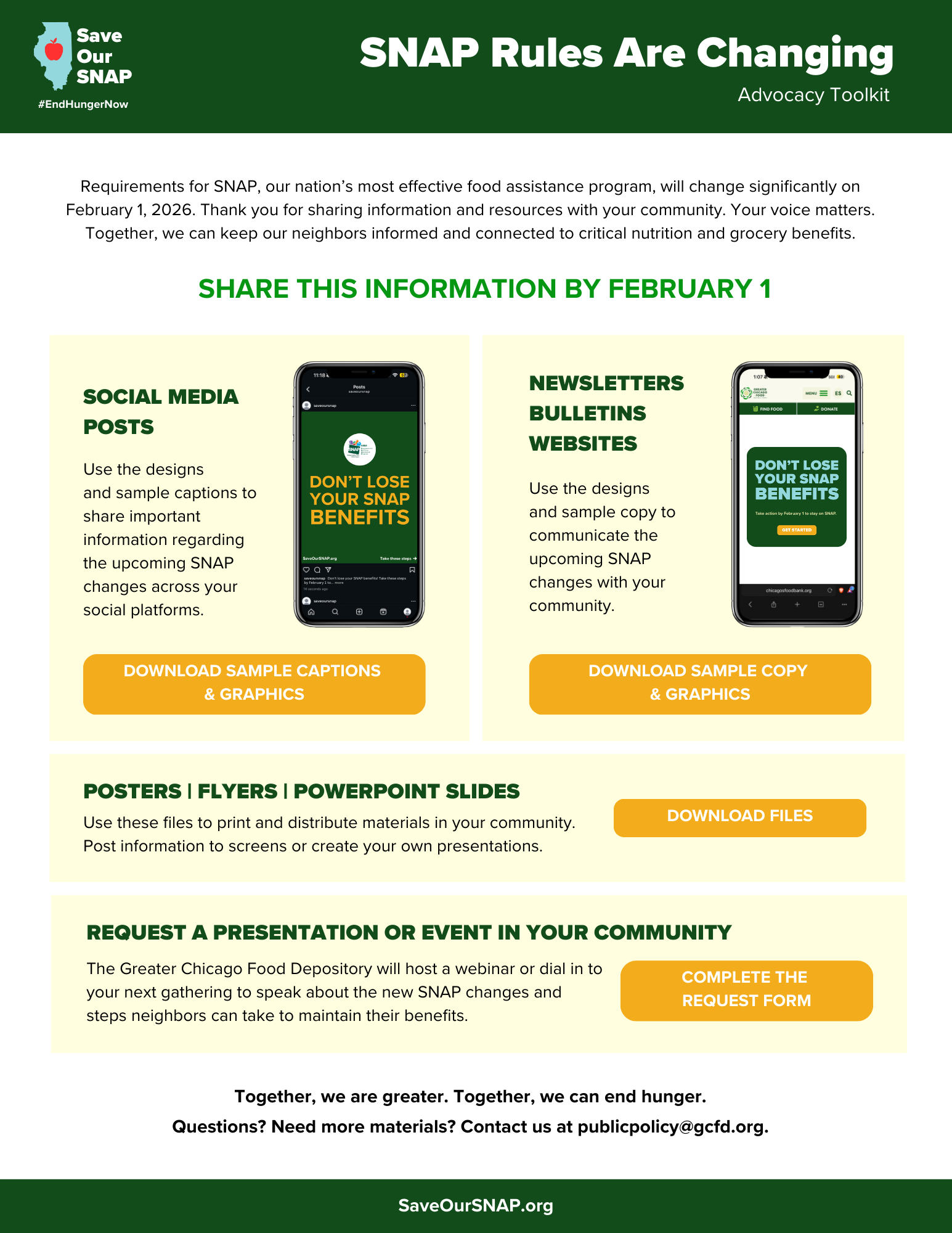 Requirements for SNAP, our nation’s most effective food assistance program, will change significantly on February 1, 2026. Thank you for sharing information and resources with your community. Your voice matters. Together, we can keep our neighbors informed and connected to critical nutrition and grocery benefits.